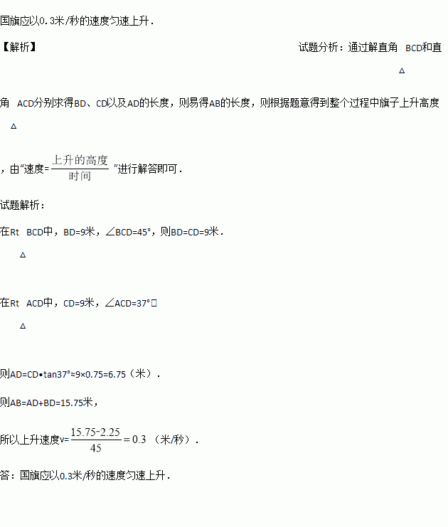 图,小东在教学楼距地面9米高的窗口C处,测得正前方旗杆顶部A点的仰角为37°,旗杆底部B点的俯角为45°,升旗时,国旗上端悬挂在距地面2.25米处,若国旗随国歌声冉冉升起,并在国歌播放45秒结束时到达旗杆顶端,则国旗应以多少米/秒的速度匀速上升?(参考数据:sin37°≈0.60,cos37°≈0.80,tan37°≈0.75)