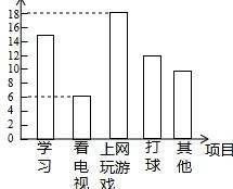 (2)在扇形统计图中,“上网玩游戏”部分所对应的圆心角是360°×(1-25%-10%-15%-20%)=108°,