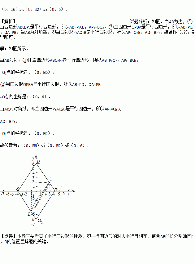 在平面直角坐标系XOY中,有A(3 , 2) ,B (-1 ,-4 ),P是X轴上的一点,Q是Y轴上的一点,若以点A,B,P,Q四个点为顶点的四边形是平行四边形,则Q点的坐标是______.