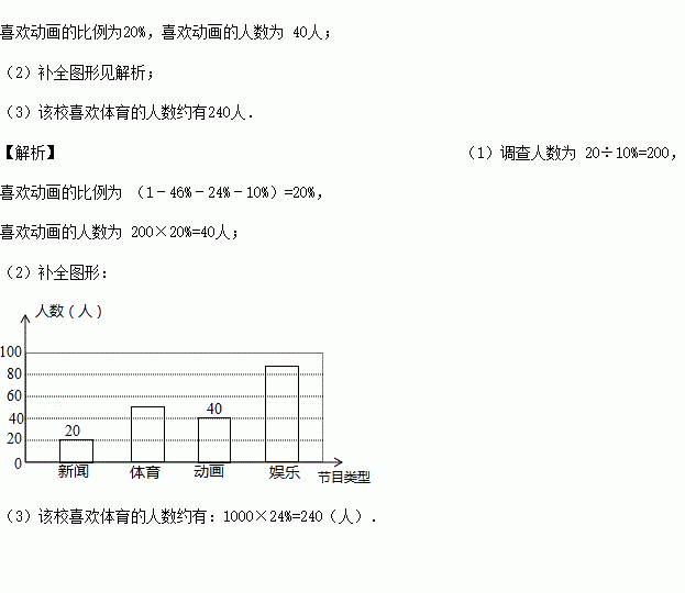 解放中学为了了解学生对新闻、体育、动画、娱乐四类电视节目的喜爱程度,随机抽取了部分学生进行调查(每人限选1项),现将调查结果绘制成如下两幅不完整的统计图,根据图中所给的信息解答下列问题.