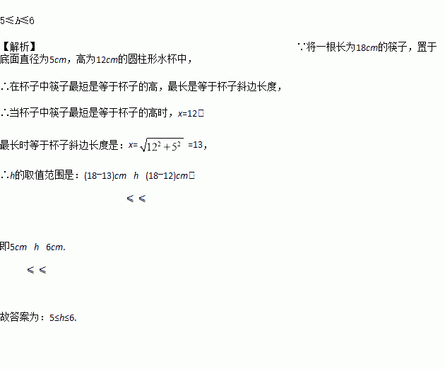 如图,一根长18cm的筷子置于底面直径为5cm.高为12cm圆柱形水杯中,露在水杯外面的长度hcm,则h的取值范围是______________.