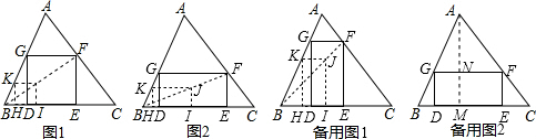 £¨2£©×÷¡÷ABCµÄ¸ßAM£¬½»GFÓÚN£®ÓÉÈý½ÇÐÎABCµÄÃæ»ýΪ36£¬Çó³öAM=6£®ÔÙÉèAN=x£¬ÓÉGF¡ÎBC£¬µÃ³ö¡÷AGF¡×¡÷ABC£¬¸ù¾ÝÏàËÆÈý½ÇÐζÔÓ¦¸ßµÄ±ÈµÈÓÚÏàËÆ±ÈÁгö±ÈÀýʽ$\frac{GF}{BC}$=$\frac{AN}{AM}$£¬ÓÉ´ËÇó³öxµÄÖµ£¬½ø¶øÇó½â¼´¿É£®