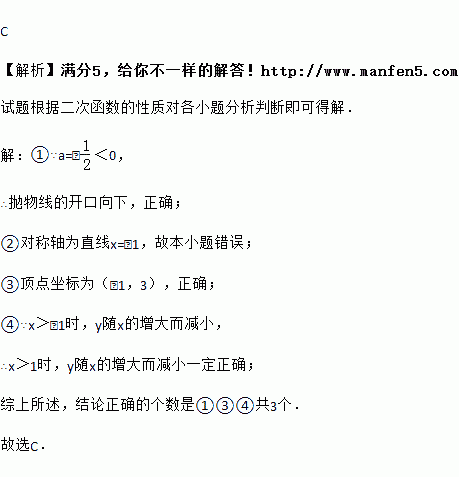 对于抛物线y=-2(x+1)2+3,下列结论:①抛物线开口向下;②对称轴为直线x=1;③顶点坐标是(-1,3);④当x>1时,y随x的增大而减小,其中正确结论的个数是( )