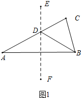 解答 解:(1)作AB的垂直平分线EF交AC于点D,此时DB+DC=AC,如图1所示,![]()