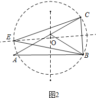 (2)作线段AB、BC的垂直平分线交于点O,以O为圆心,OA为半径作⊙O,交BC的垂直平分线于E,LJ EC、EB,△BCE就是所求是三角形.如图2所示,![]()