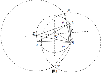 (3)按照(2)的方法找到点E,再以点E为圆心,以EC或EB长为半径作圆,再以点B为圆心,a长为半径作圆,两圆的交点为点H和H′,再连接BH或BH′交△ABC的外接圆于点F,则点F或F′为所求.如图3所示,