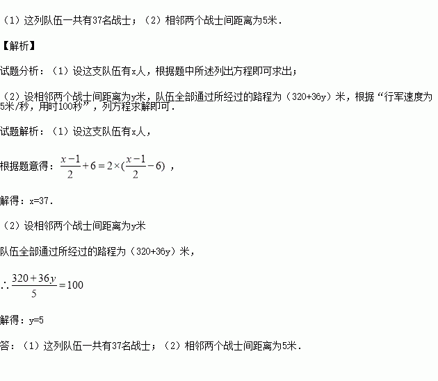 £¨2£©ÕâÁжÓÎéÒª¹ýÒ»×ù320Ã׵ĴóÇÅ£¬Îª°²È«Æð¼û£¬ÏàÁÚÁ½¸öսʿ±£³ÖÏàͬµÄÒ»¶¨¼ä¾à£¬ÐоüËÙ¶ÈΪ5Ã×/Ã룬´ÓµÚһλսʿ¸ÕÉÏÇŵ½È«Ìåͨ¹ý´óÇÅÓÃÁË100Ãëʱ¼ä£¬ÇëÎÊÏàÁÚÁ½¸öսʿ¼ä¾àÀëΪ¶àÉÙÃ×£¨²»¿¼ÂÇսʿÉí²ÄµÄ´óС£©£¿
