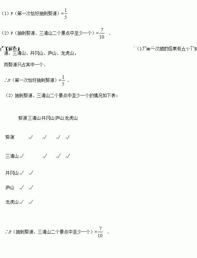 “五一”小长假小武举家计划到本省五个景点:婺源、三清山、井冈山、庐山、龙虎山旅玩.后因时间问题,只能选其中的二个景点,小武建议通过抽签决定,用五张小纸条分别写上五个景点做成五个签,让小武抽二次,每次抽一个签,每个签抽到的机会相等.