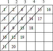 点评 (1)此题主要考查了探寻数字规律问题,注意观察总结规律,并能正确的应用规律,解答此题的关键是判断出:①第n斜列的数字的个数是n;②奇数斜列从左下角到右上角,数字逐渐增加;③偶数斜列从左下角到右上角,数字逐渐减小.