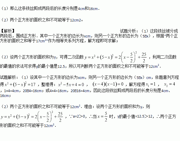 (2)两个正方形的面积之和可能等于12cm2吗?若能,求出两段铁丝的长度;若不能,请说明理由.