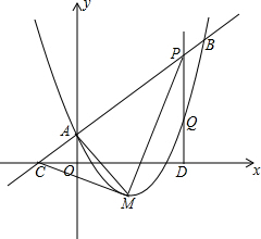 (3)先确定C(-1,0),再利用两点间的距离公式计算出AC=$\sqrt{2}$,AM=2$\sqrt{2}$,MC=$\sqrt{10}$,则可利用勾股定理的逆定理证明△ACM为直角三角形,∠CAM=90°,由于∠CAM=∠PAM=90°,根据相似三角形的判定方法,当$\frac{AM}{AP}$=$\frac{AC}{AM}$时,△AMP∽△ACM,利用相似比计算出AP=4$\sqrt{2}$,则利用两点间的距离公式得到m2+(m+1-1)2=(4$\sqrt{2}$)2,当$\frac{AM}{AM}$=$\frac{AC}{AP}$时,△AMP∽△AMC,利用相似比得AP=AC=$\sqrt{2}$,则利用两点间的距离公式得到m2+(m+1-1)2=($\sqrt{2}$)2,再分别解关于m的一元二次方程求出m,从而可得到满足条件的P点坐标.