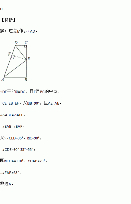 在数学活动课上,小明提出这样一个问题:如图,∠B=∠C=90°,E是BC的中点,DE平分∠ADC,∠CED=35°,则∠EAB的度数是( )