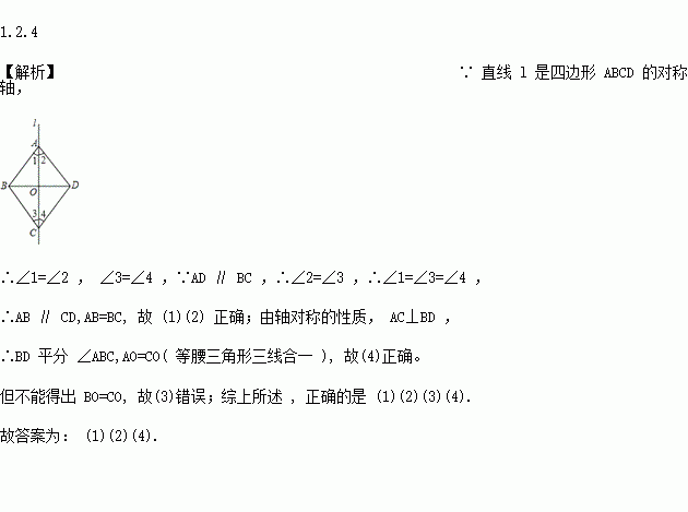 如图,直线l是四边形ABCD的对称轴,若AD∥BC,则下列结论:(1)AB∥CD;(2)AB=AD;(3)BO=CO,(4)BD平分∠ABC.其中正确的有________________(填序号).
