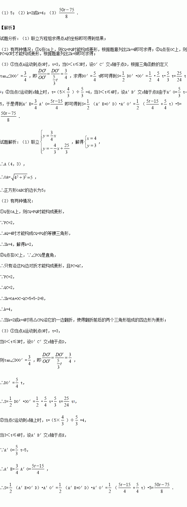 £¨3£©ÈôÕý·½ÐÎÒÔÿÃë¸öµ¥Î»µÄËÙ¶ÈÑØÉäÏßAOÏ»¬£¬Ö±ÖÁ¶¥µãCÂäÔÚxÖáÉÏʱֹͣÏ»¬£®ÉèÕý·½ÐÎÔÚxÖáÏ·½²¿·ÖµÄÃæ»ýΪS£¬ÇóS¹ØÓÚ»¬ÐÐʱ¼ätµÄº¯Êý¹ØÏµÊ½£¬²¢Ð´³öÏàÓ¦×Ô±äÁ¿tµÄȡֵ·¶Î§£®