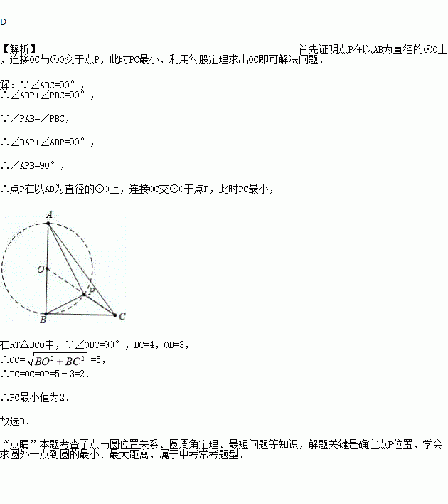 如图,Rt△ABC中,AB⊥BC,AB=6,BC=4,P是△ABC内部的一个动点,且满足∠PAB=∠PBC,则线段CP长的最小值为( ).