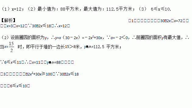 (3)当这个苗圃园的面积不小于100平方米时,直接写出x的取值范围.