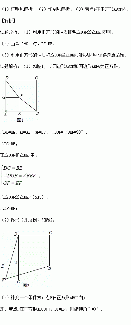 正方形ABCD和正方形AEFG有公共顶点A,将正方形AEFG绕点A按顺时针方向旋转,记旋转角∠DAG=α,其中0°≤α≤180°,连结DF,BF,如图.