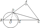 分析 (1)连接OD,DE,如图,由三角形内角和定理得∠ACD+∠ADC=90°,而∠B=∠ACD,则∠B+∠ADC=90°,加上∠B=∠BDO,则∠BDO+∠ADC=90°,所以∠ODC=90°,于是根据切线的判定定理得到CD是⊙O切线;