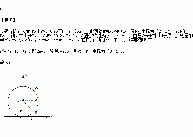 如图,⊙M与x轴相切于原点,平行于y轴的直线交圆于P、Q两点,P点在Q点的下方,若P点的坐标是(2,1),则圆心M的坐标是( )