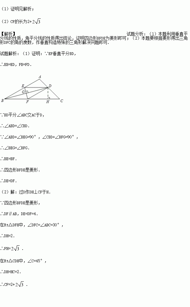 (2)若∠ABC=30°,∠C=45°,DE=4,求CF的长.