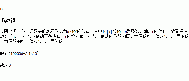 我国作家莫言获得诺贝尔文学奖之后,他的代表作品《蛙》的销售量就比获奖之前增长了180倍,达到2100000册.把2100000用科学记数法表示为( )