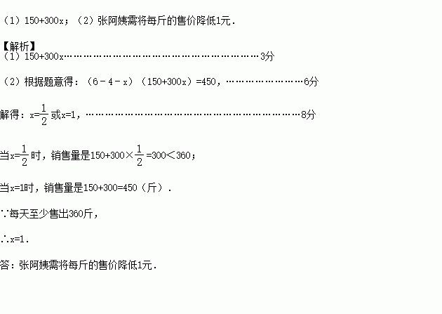 (2)销售这种水果要想每天盈利450元,张阿姨需将每斤的售价降低多少元?
