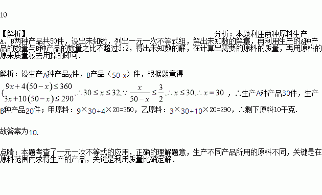 某工厂现有甲种原料360kg,乙种原料290kg,计划利用这两种原料生产A、B两种产品共50件.已知生产一件A种产品需甲种原料9kg、乙种原料3kg;生产一件B种产品需甲种原料4kg、乙种原料10kg.若生产的A种产品的数量与B种产品的数量之比不超过3:2,则生产结束后剩下的原料共__________kg.