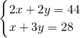 分析:设每件T恤的给俺个为x元,每瓶矿泉水的价格为y元,根据条件可以建立方程2x+2y=44及x+3y=28,由这两个方程建立方程组求出其解即可.