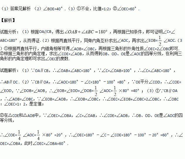 如图,射线OA∥射线CB,∠C=∠OAB=100°.点D、E在线段CB上,且∠DOB=∠BOA, OE平分∠DOC.