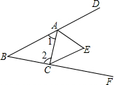 分析:根据三角形内角和定理、角平分线的定义以及三角形外角定理求得∠DAC+∠ACF=(∠B+∠B+∠1+∠2)=;最后在△AEC中利用三角形内角和定理可以求得∠E的度数.