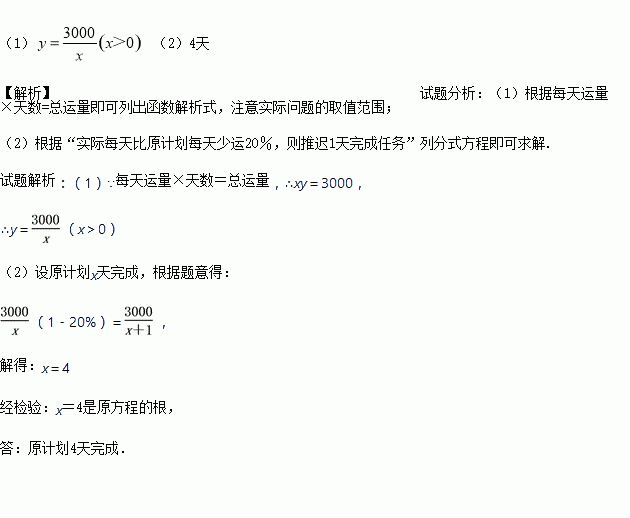 (2)因受到沿线道路改扩建工程影响,实际每天的运输量比原计划少20%,以致推迟1天完成运输任务,求原计划完成运输任务的天数.