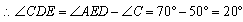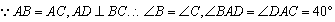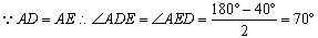 在△ABC中,AB=AC,AD⊥BC,∠BAD=40°,AD=AE,求∠CDE的度数。