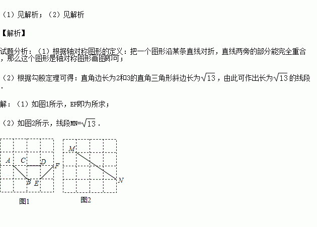 (1)图1中已知线段AB、CD,画线段EF,使它与AB、CD组成轴对称图形(要求:画出一个即可);