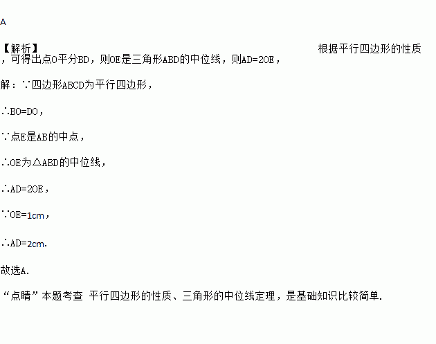 如图,在?ABCD中,AC、BD相交于点O,点E是AB的中点.若OE=1cm,则AD的长是( )cm.