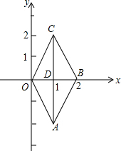 解答 解:∵点A与点C关于x轴对称,点C的坐标为(1,2),∴点A的坐标为(1,-2),∵点B的坐标为(2,0),∴DB=1,∴OB=2,∵点C的坐标为(1,2),∴CD=2,∴AC=4.