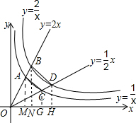 ∵直线y=2x、y=$\frac{1}{2}$x分别与双曲线y=$\frac{1}{x}$、y=$\frac{2}{x}$在第一象限的分支交于A、B、C、D四点,