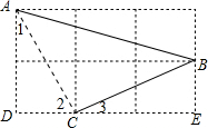 (2)方法1,根据勾股定理求得AC=$\sqrt{{2}^{2}+{1}^{1}}$=$\sqrt{5}$,BC=$\sqrt{{2}^{2}+{1}^{2}}$=$\sqrt{5}$,AB=$\sqrt{{3}^{2}+{1}^{2}}$=$\sqrt{10}$,得到AC=BC,由勾股定理的逆定理得到AC2+BC2=AB2,于是得到结论;方法2,如图,题干△ACD≌△BCE,得到∠1=∠3,AC=BC,根据余角的性质得到∠ACB=90°,于是得到结论.