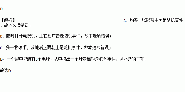 C. 抛一牧捌币,正面向上 D. 一个袋中装有5个黑球,从中摸出一个球是黑球