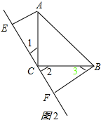 ②如图2所示:先证出∠1=∠3,由勾股定理求出CE,再证明△BCF≌△CAE,得出对应边相等CF=AE=3,得出EF=CE+CF即可.