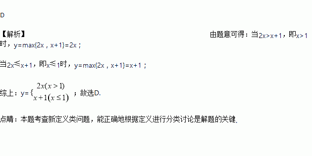 记max{x,y}表示x,y两个数中的最大值,例如max{1,2}=2,max{7,7}=7,则关于x的一次函数y=max{2x,x+1}可以表示为( )