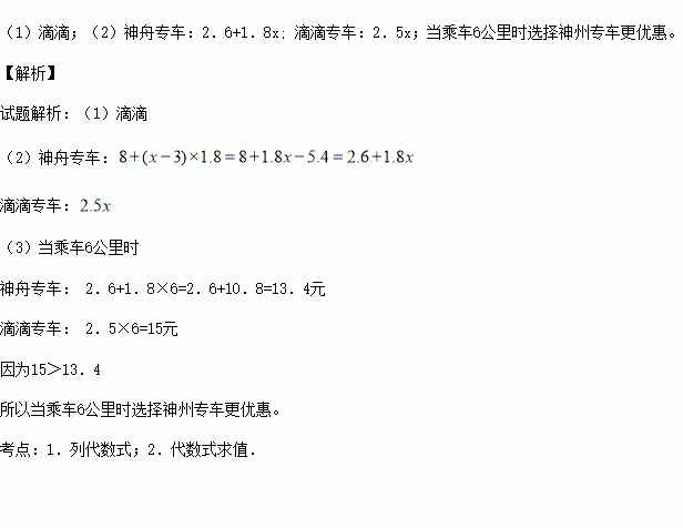 (2)若顾客乘坐专车x公里(x>3),请用含x的代数式分别表示乘坐滴滴专车和神舟专车的收费情况。