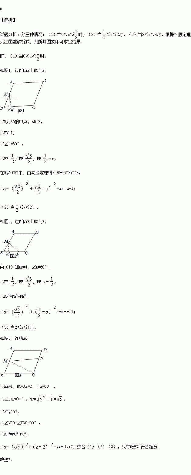 (2015秋•藁城区期末)如图,菱形ABCD中,AB=2,∠B=60°,M为AB的中点.动点P在菱形的边上从点B出发,沿B→C→D的方向运动,到达点D时停止.连接MP,设点P运动的路程为x,MP 2=y,则表示y与x的函数关系的图象大致为( )