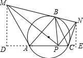 分析 过M作MD⊥AC于D,过N作NE⊥AC于E,由MN是⊙O的切线,根据弦切角定理等等∠NAB=∠ACB,∠NCB=∠CAB,于是得到∠MAC=∠NCA,∠DAM=∠ECN,推出△ADM∽△CEN,得到$\frac{MD}{NE}=\frac{DP}{EP}$,由MD∥BP∥NE,得到$\frac{MB}{NB}=\frac{DP}{EP}$,由于MA,NC分别是⊙O的切线,得到AM=BM,CN=BN,于是得到$\frac{MD}{NE}=\frac{MA}{NC}=\frac{MB}{NB}=\frac{DP}{EP}$,证得Rt△DMP∽Rt△ENP,即可得出结论.