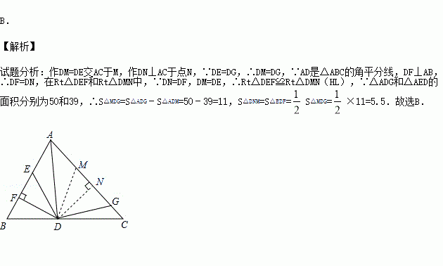 如图,AD是△ABC的角平分线,DF⊥AB,垂足为F,DE=DG,△ADG和△AED的面积分别为50和39,则△EDF的面积为( )