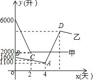 分析 根据函数图象,甲储油库向乙储油库输油期间每天的输油量是(6000-2000)÷2=2000(升);由图可知在第4天时,乙储油库的油量开始上升,所以在第4天时甲储油库输出的油开始注入乙储油库;乙储油库每天减少(1600-1100)÷2=250(升),由直线AB的函数解析式得出A点坐标,求出此时乙储油库的最低油量,根据2天后乙的储油量=乙4天原有的储油量+甲储油库的放油量-乙2天的放油量,即可得到D点的最高油量.
