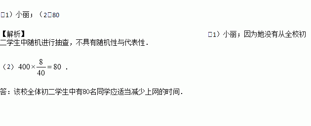 为了解某校初二学生每周上网的时间,两位学生进行了抽样调查.小丽调查了初二电脑爱好者中40名学生每周上网的时间;小杰从全校400名初二学生中随机抽取了40名学生,调查了每周上网的时间.小丽与小杰整理各自样本数据,如下表所示.