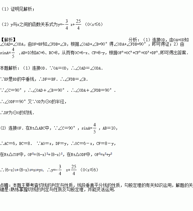 ,AB=10,点O为AC上一点,以OA为半径作⊙O交AB于点D,BD的中垂线分别交BD,BC于点E,F,连结DF.