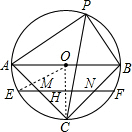 分析 连结OC交MN于H,连结OE,如图,由于∠APB的平分线交⊙O于点C,则$\widehat{AC}$=$\widehat{BC}$,根据垂径定理得OC⊥AB,再证明MN为△CAB的中位线,根据三角形中位线定理得到得到MN∥AB,MN=$\frac{1}{2}$AB,接着利用平行线的性质得到OC⊥MN,且OH=$\frac{1}{2}$OC=2,然后利用垂径定理得到EH=FH,则可根据勾股定理计算出EH=2$\sqrt{3}$,于是得到EF=2EH=4$\sqrt{3}$.
