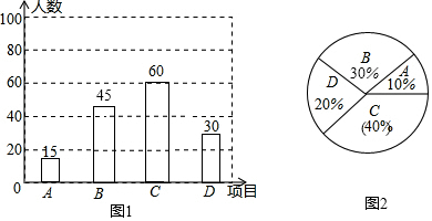 分析 (1)根据A项目的人数及其百分比可得总人数,用360°乘以C项目的百分比可得其圆心角度数,总人数乘以C项目的百分比可得其人数;