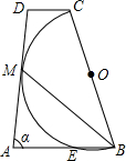 如图,在梯形ABCD中,AB∥CD,AD=BC,底角为a,以腰BC为直径作圆,与另一腰切于点M,交较长底边AB于点E,则